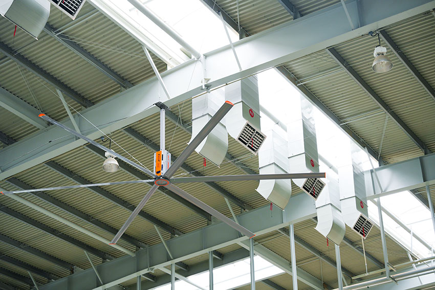 工業(yè)大風(fēng)扇:在車間高空位置安裝大功率工業(yè)風(fēng)扇,通過大風(fēng)量的氣流循環(huán),將冷風(fēng)機(jī)產(chǎn)生的冷風(fēng)更有效地散布到車間的每個角落,同時促進(jìn)車間內(nèi)空氣的流通,避免局部高溫和悶熱。