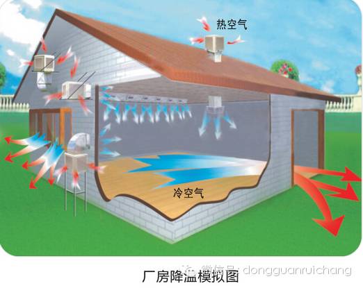 過去是采用自然風,以熱壓與風壓原理通過排氣孔、天窗進行通風換氣,也有在屋頂裝排氣風帽來達到上述目的,但其效果顯然不佳。從圖中可以看出,室外新鮮空氣經(jīng)過蒸發(fā)式冷氣機的過濾、降溫后,通過風管,或者直接通過風口,源源不斷送到室內(nèi)各個角落,由于系統(tǒng)采用了大量的新風,使室內(nèi)處于正壓狀態(tài),從而可以把室內(nèi)帶有異味、粉塵、混濁悶熱的空氣排出,最終達到降溫換氣的目的。