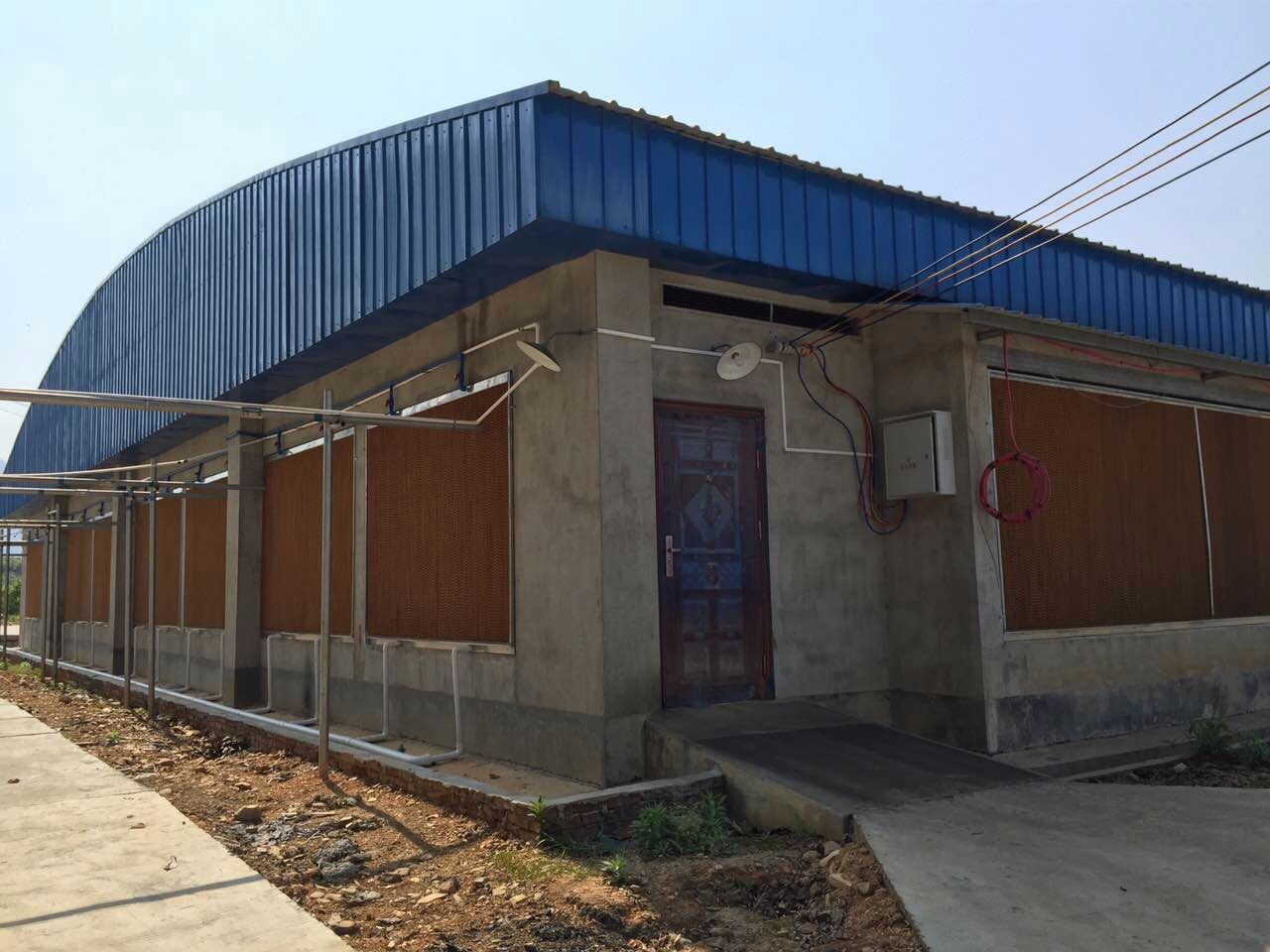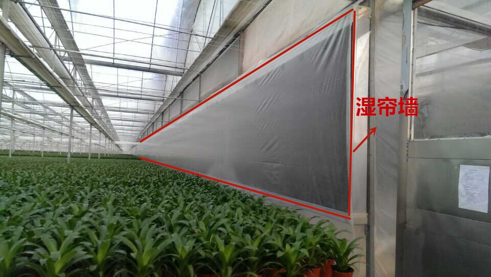 對于常年高溫地區(qū)或?qū)囟日{(diào)控要求較高的溫室,濕簾風(fēng)機(jī)降溫方法是目前使用最為廣泛和有效的技術(shù),具有效果顯著、經(jīng)濟(jì)可靠的優(yōu)點(diǎn)。濕簾風(fēng)機(jī)系統(tǒng)的核心是能讓水均勻地淋濕整個降溫濕簾墻,空氣穿透濕簾時,與濕潤表面進(jìn)行的水氣交換空氣的顯熱轉(zhuǎn)化為汽化潛熱,實(shí)現(xiàn)對空氣的加濕與降溫。一般濕簾安裝在溫室的北側(cè)山墻一端,風(fēng)機(jī)安裝在溫室南側(cè)山墻一端。當(dāng)需要降溫時,通過控制系統(tǒng)的指令啟動風(fēng)機(jī),將室內(nèi)的空氣強(qiáng)行抽出,造成負(fù)壓;同時水泵將水打在對面的濕簾墻上。室外空氣被負(fù)壓吸入室內(nèi)時,以一定的速度從濕簾的縫隙穿過,導(dǎo)致水分蒸發(fā)、降溫,冷空氣流經(jīng)溫室,吸收室內(nèi)熱量后,經(jīng)風(fēng)機(jī)排出,從而達(dá)到循環(huán)降溫的目的。使用風(fēng)機(jī)濕簾系統(tǒng)時,要求溫室的密封性要好,否則會由于熱風(fēng)滲透而影響濕簾的降溫效果。