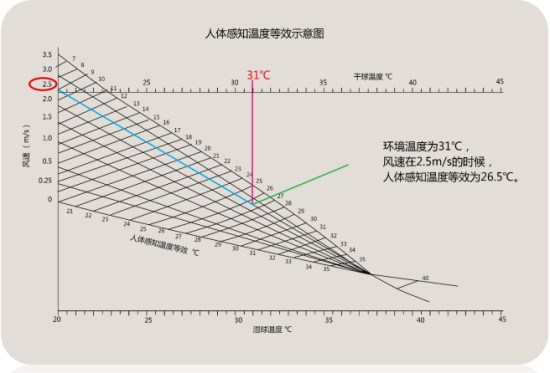 瑞泰風(fēng)節(jié)能風(fēng)扇運(yùn)行時(shí)加快了空氣流動(dòng)的速度,從而加快了汗液的蒸發(fā),汗液蒸發(fā)的過程中帶走了身體上的熱量,所以說,我們會(huì)感覺到?jīng)隹臁6唧w風(fēng)速對(duì)人體感受能有多大影響,上圖為美國研究數(shù)據(jù)圖表。對(duì)應(yīng)不同溫度不同風(fēng)速,人體感受差異變化曲線。